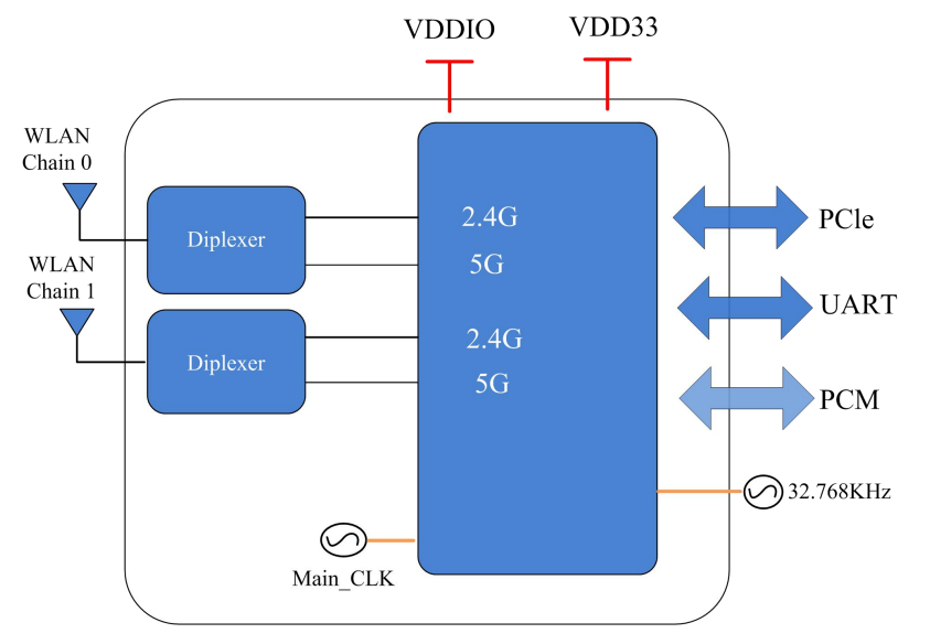System-on-chip System-on wireless altamente integrato (SOC) (SOC) per 5 GHz 802.11ac o 2.4G / 5G 802.11n Applicazioni WLAN.Multiplex spaziale dual-streaming fino a 867 velocità dati Mbps.