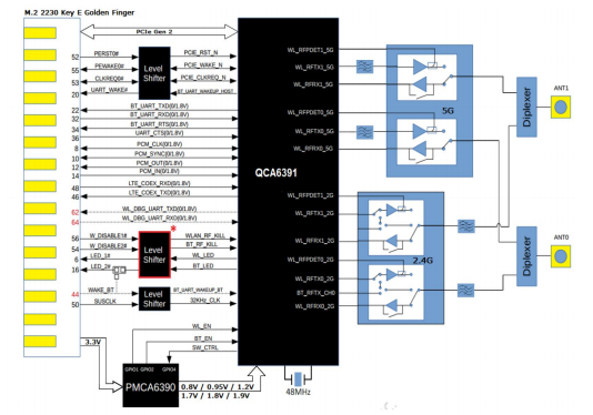 Supporta l'interfaccia a bassa potenza PCIE (w / l1 sub-state) per l'interfaccia WLAN e UART / PCM per Bluetooth.