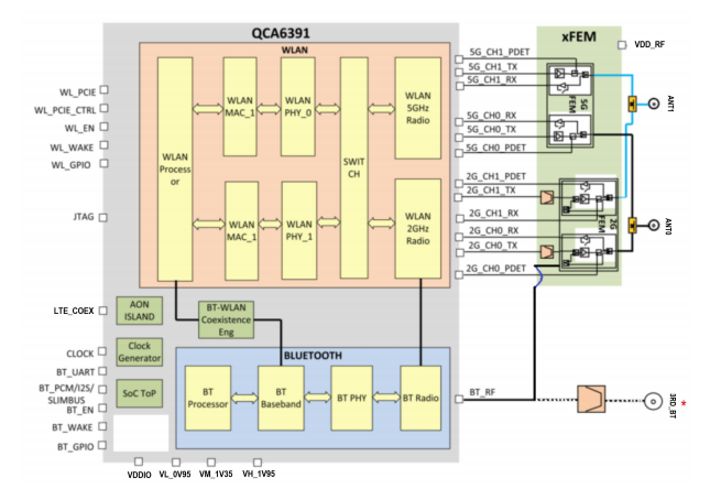 Supporta l'interfaccia a bassa potenza PCIE (w / l1 sub-state) per l'interfaccia WLAN e UART / PCM per Bluetooth.